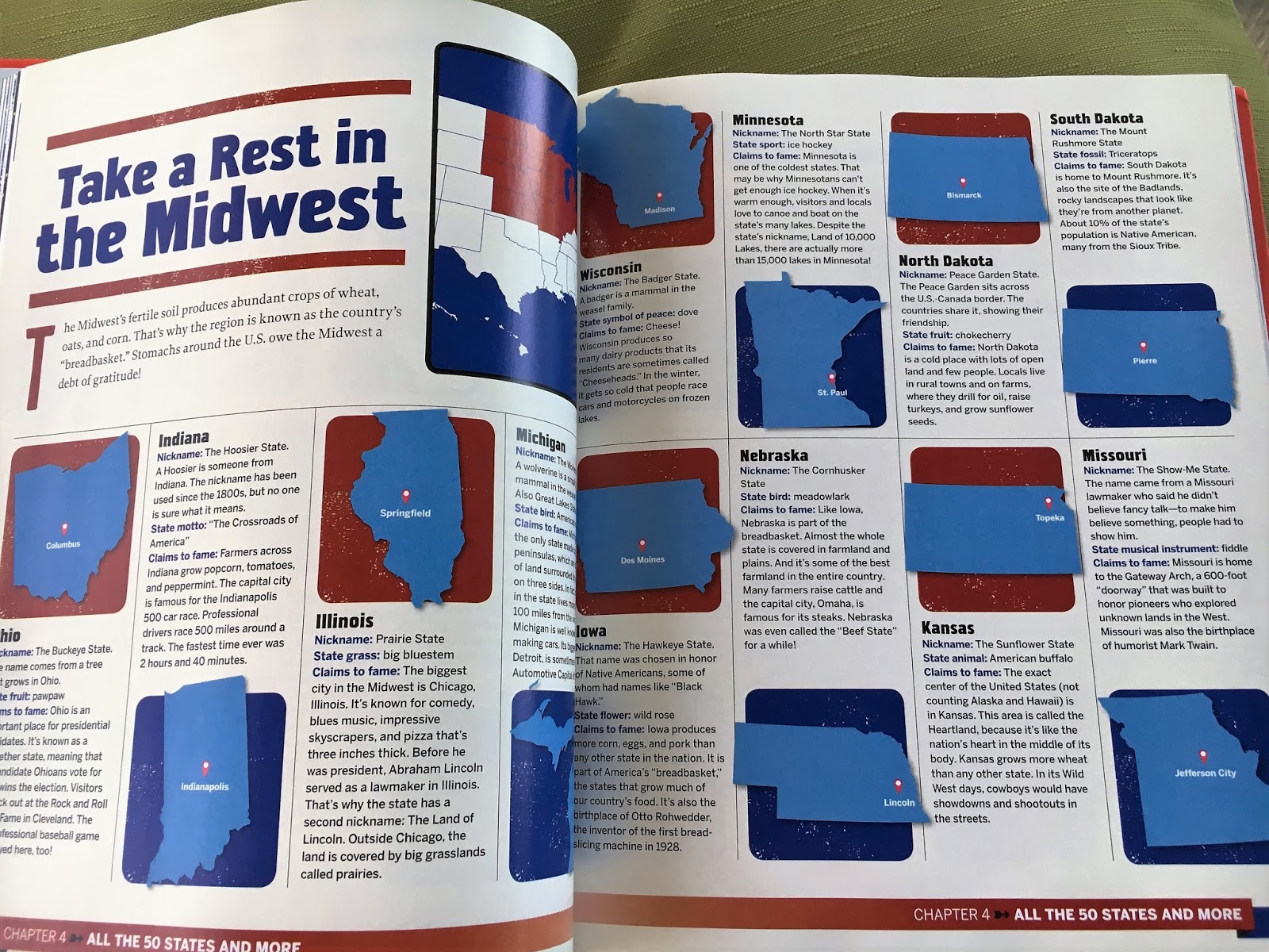 One chapter features each state including its nickname and claim to fame. Another section features the wild animals that inhabit the states and regions of our country.