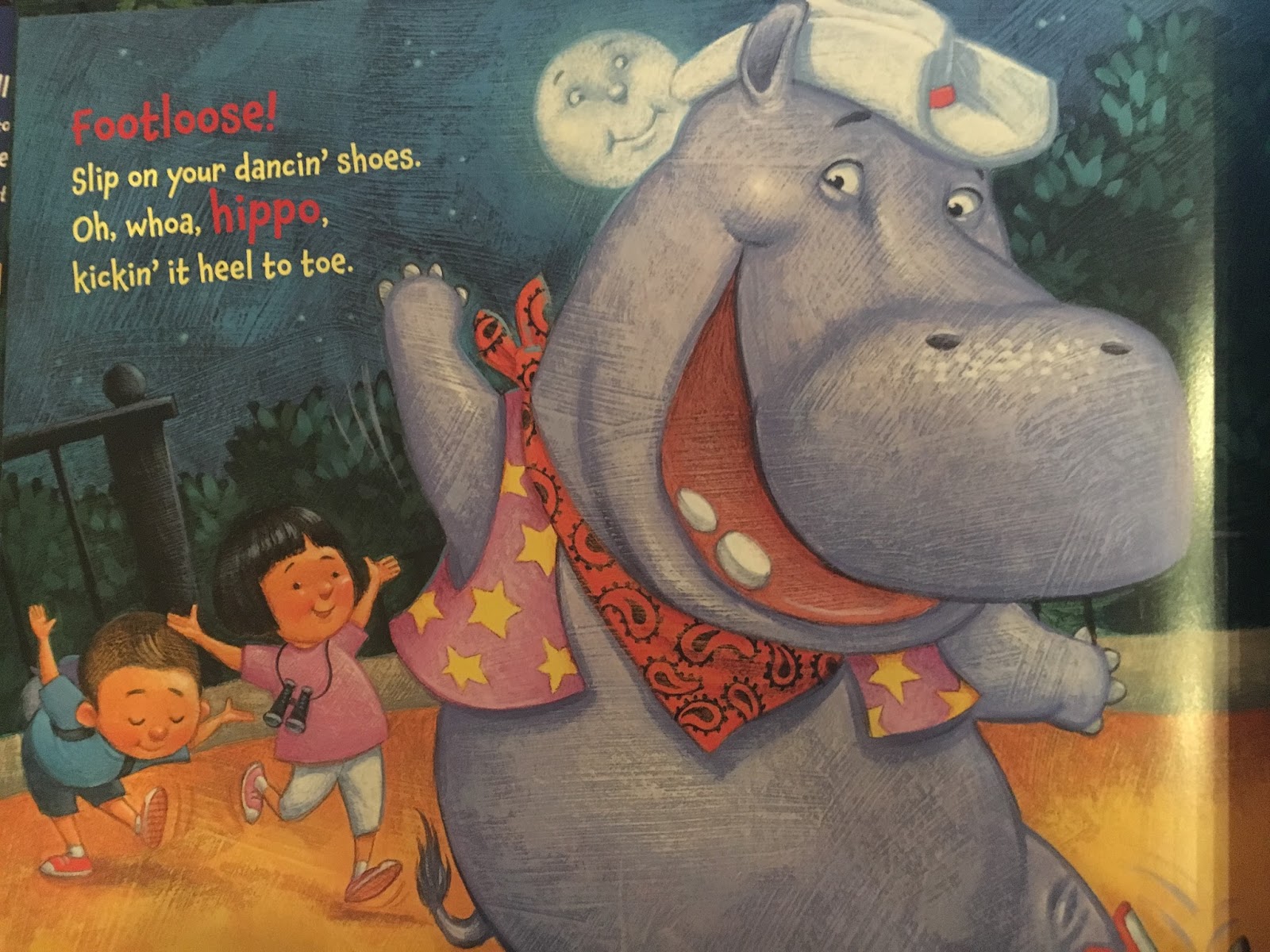 The zoo is getting ready to close up for the day. There is a full moon which means the animals are planning some fun at the zoo after it closes. The animals watch to make sure everyone is gone and then they begin to let loose. Your child may notice two children peeking between the bushes who didn’t leave like they should have. They are treated to quite the show during the animals dance party.